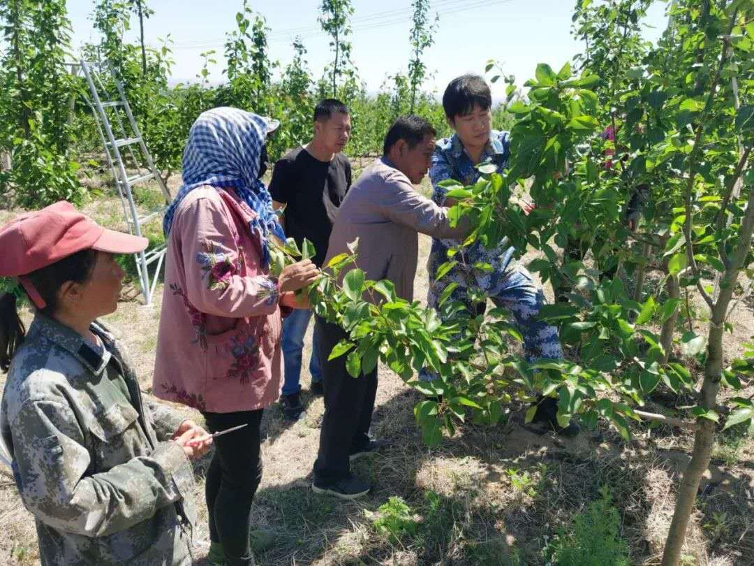 王躍(右一)指導村集體經濟果園工人稀果